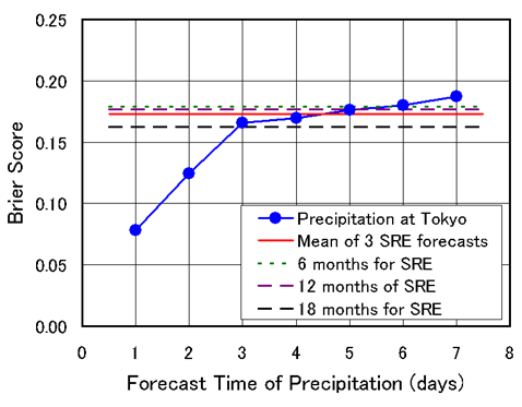 | The figure shown below compares the Brier score and Mean log-likelihood of our results with the result of probability forecast of precipitation at Tokyo in 2006. Here we used precipitation probability data from http://homepage3.nifty.com/i_sawaki/WeatherForecast/index.htm. Both scores show that the earthquake predictability is similar to that of the precipitation forcast of the day 3-5 days later. | ||